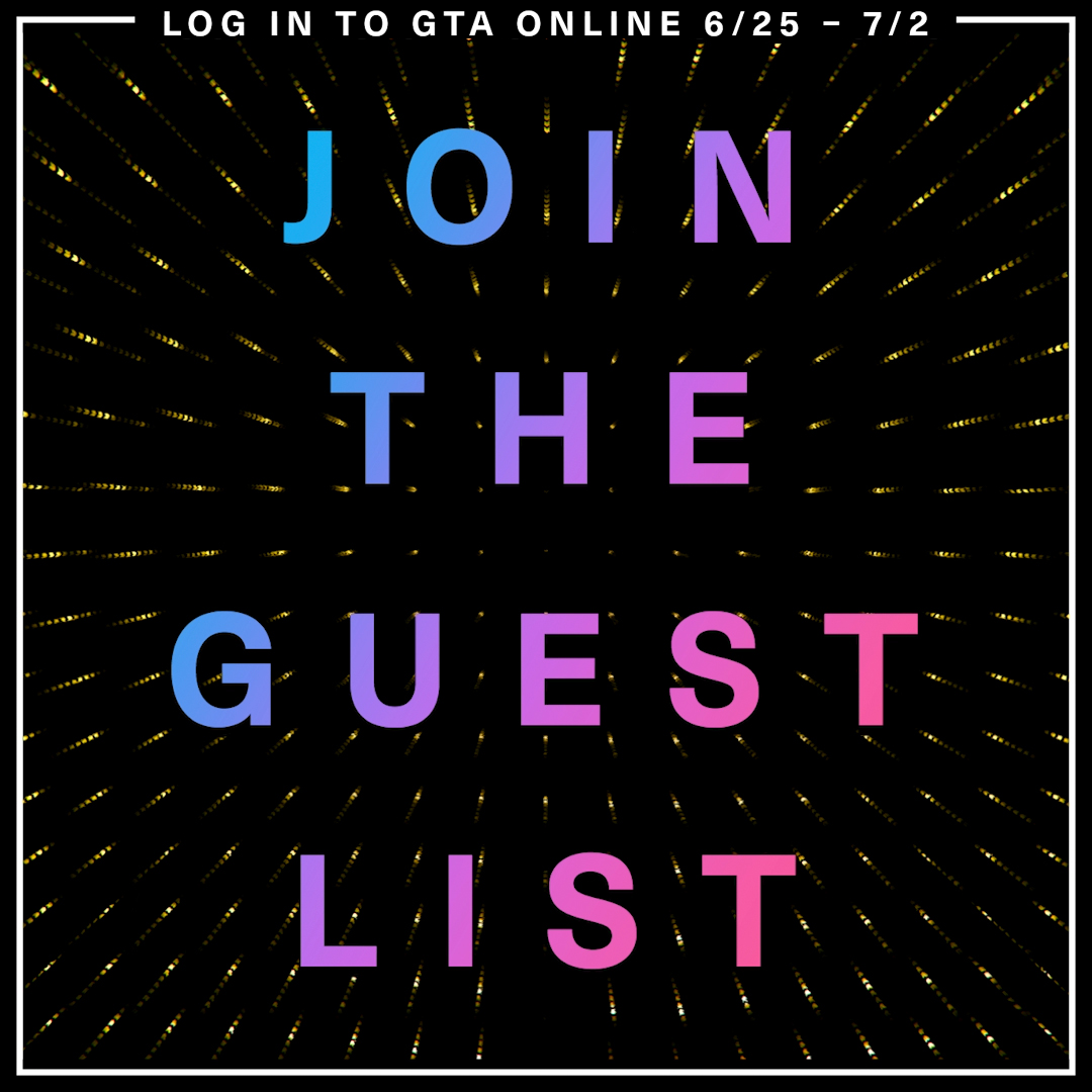 Get on the guest list for access to the best of LS club life along with extracurricular business perks. Log into GTA Online at any point between today and Monday July 2nd and you will be automatically added to the Guest List. As a thank you for joining the Guest List, return to GTA Online between July 3-9 and you’ll get GTA$300,000 and an exclusive Orange Wireframe Bodysuit (GTA$ will be deposited in Maze Bank accounts no later than July 9th).